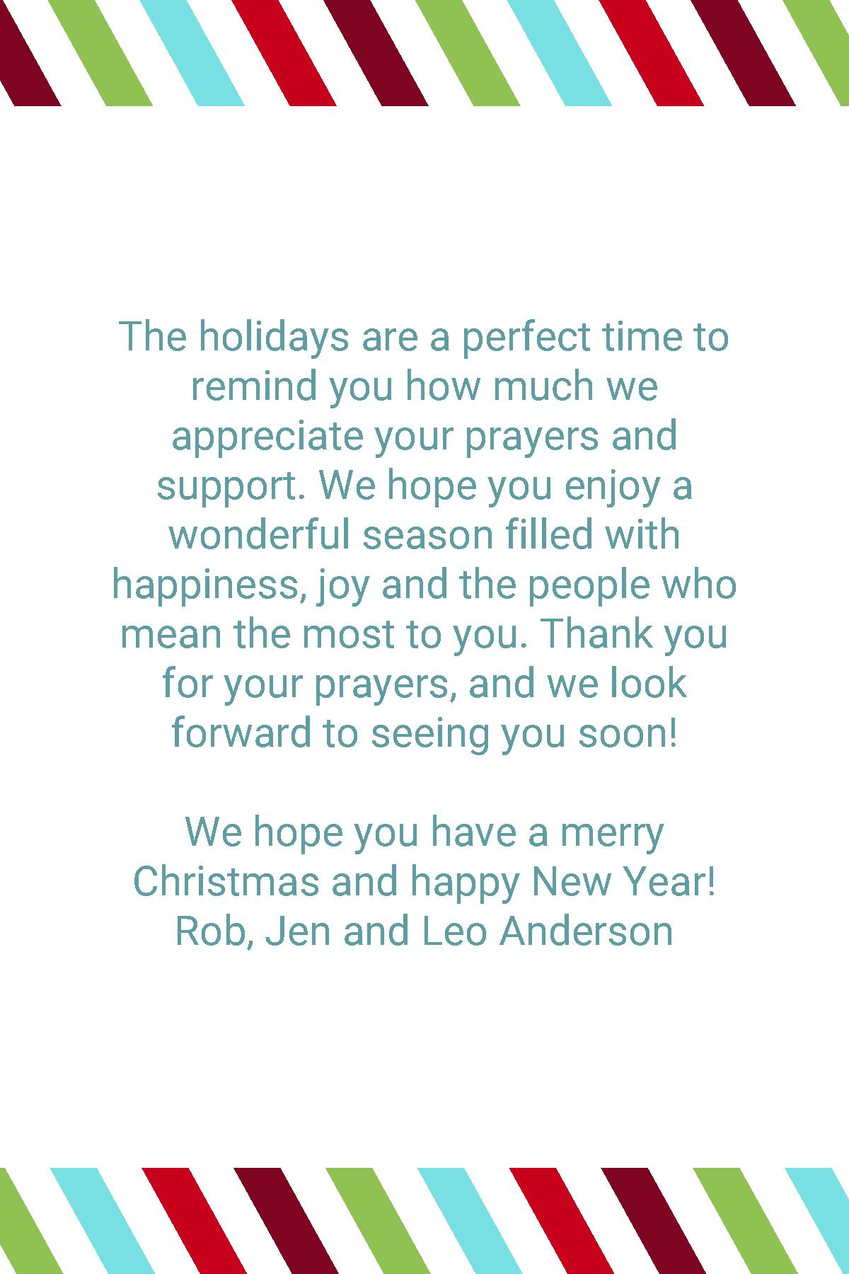 The holidays are a perfect time to remind you how much we appreciate your prayers and support. We hope you enjoy a wonderful season filled with happiness, joy and the people who mean the most to you. Thank you for your prayers, and we look forward to seeing you soon! We hope you have a merry Christmas and happy New Year! Rob, Jen and Leo Anderson