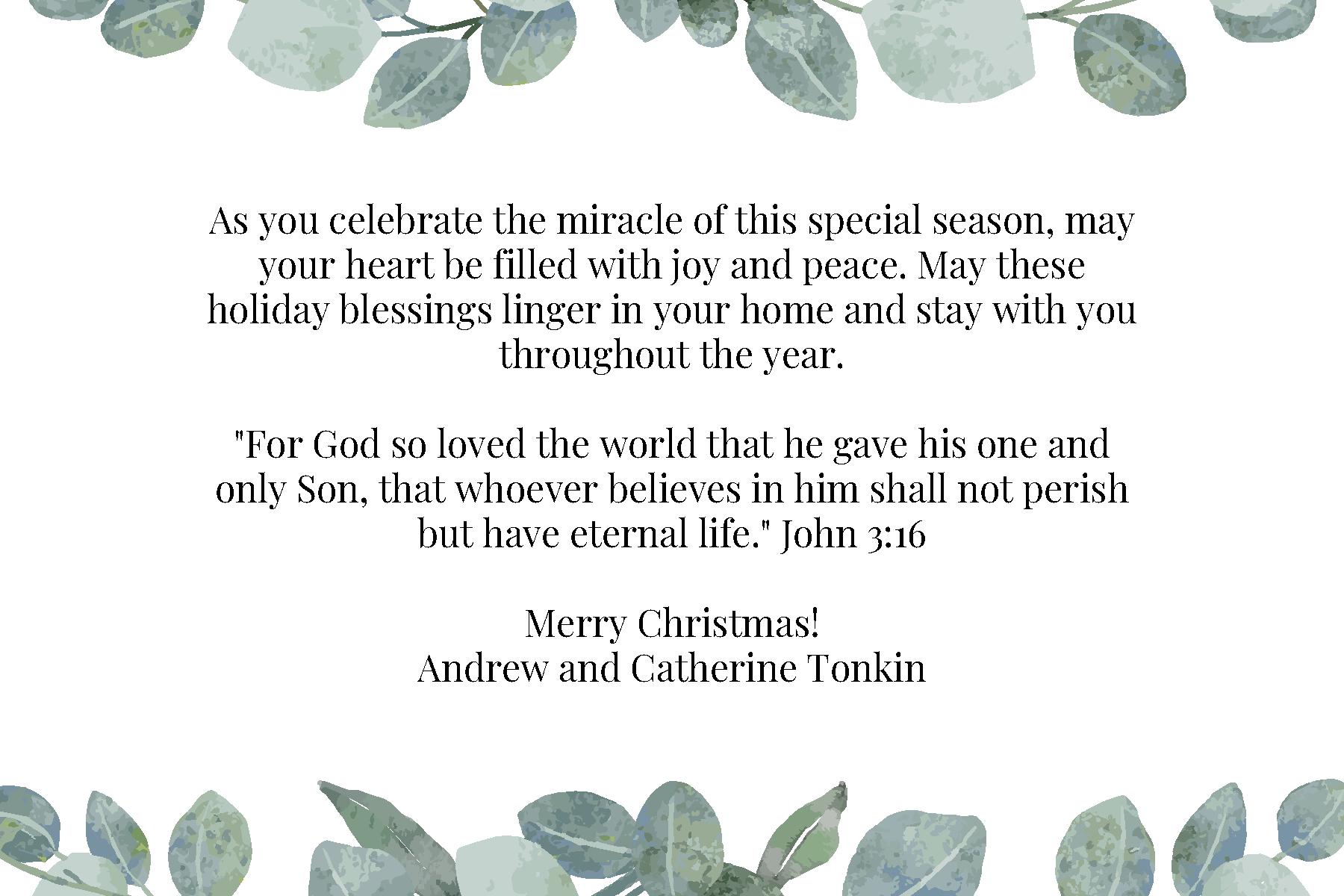 As you celebrate the miracle of this special season, may your heart be filled with joy and peace. May these holiday blessings linger in your home and stay with you throughout the year. "For God so loved the world that he gave his one and only Son, that whoever believes in him shall not perish but have eternal life." John 3:16 Merry Christmas! Andrew and Catherine Tonkin